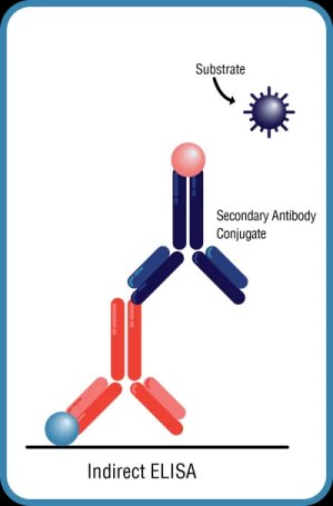 間接ELISA,其中抗原固定在ELISA板上,二抗帶有標記(圖1B)